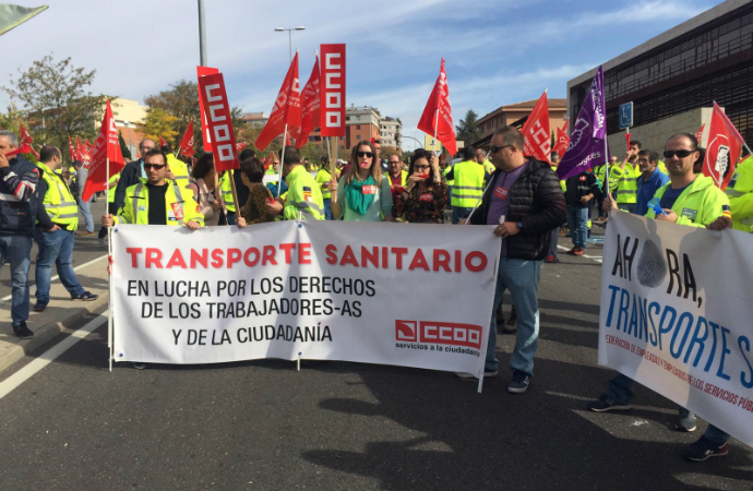Pancartas con epígrafes como 'Transporte sanitario de gestión publica 100 %' o 'Por el empleo en el transporte sanitario. No a los despidos, no a la precariedad', entre otros, se han podido leer durante una concentración, la tercera de las convocadas por CCOO y UGT, que tendrá continuidad con paros parciales y completos durante la próxima semana.