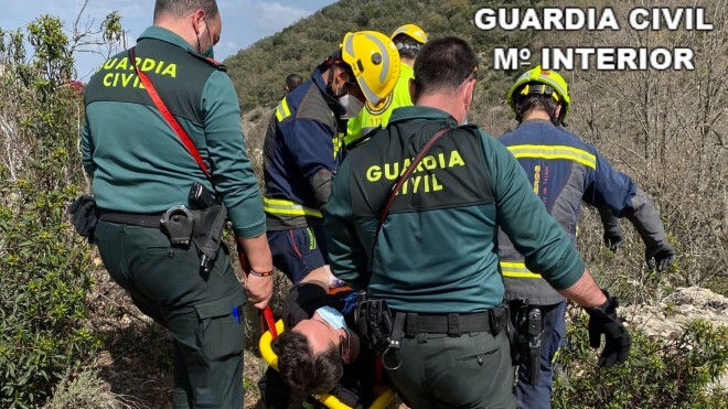 Estos agentes, junto con personal de este Consorcio de Bomberos, personal sanitario y de Protección Civil, recorrieron unos 4 km a pie hasta llegar al herido. Esta persona se encontraba consciente e informó que una piedra de grandes dimensiones se había desprendido y le había golpeado en su rodilla lo que le impedía poder volver caminando.