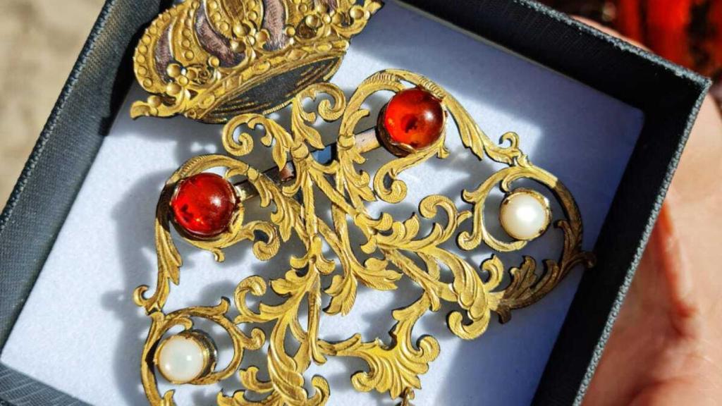 Además, la primera edil ha querido rendir homenaje a los fieles de su ciudad y, para ello, les ha hecho entrega de un anagrama mariano realizado por el maestro damasquinador Óscar Martín Garrido que, acto seguido, han prendido al Simpecado de la Virgen del Rocío de Toledo.