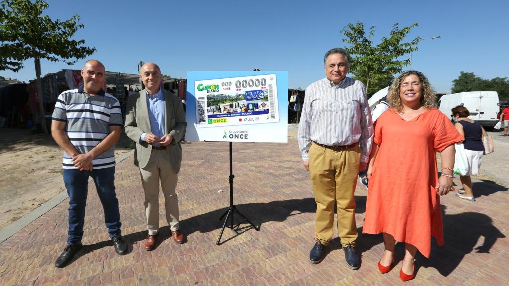 El concejal de Empleo, Francisco Rueda, y el delegado territorial de la Organización Nacional de Ciegos Españoles (ONCE) en Castilla-La Mancha, Carlos Javier Hernández, han presentado el cupón que este grupo social dedica al mercadillo de Toledo El Martes para el próximo sorteo del 12 de julio. La presentación se ha llevado a cabo en el mercadillo, en el barrio de Santa Teresa, y ha contado con Mario Lobato, representante de los comerciantes, y Marta Medina, concejala del equipo de Gobierno.