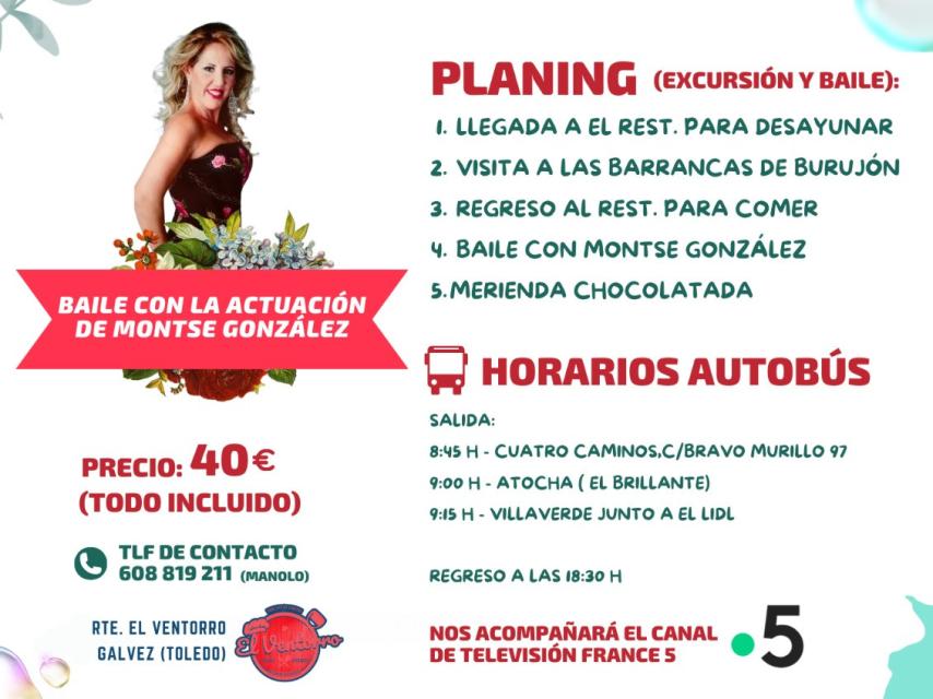 El precio es de 40 euros por persona, independientemente de su sexo, y la organización ha dispuesto un autobús desde Madrid para acudir a Gálvez desde allí, donde regresarán a las 18:30 horas.