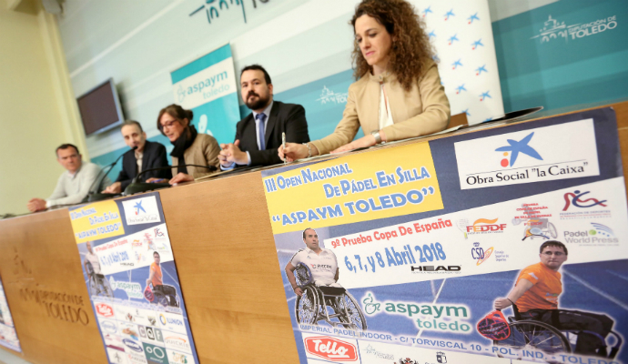 La diputada provincial de Educación, Cultura e Igualdad, Ana Gómez, ha presentado este torneo junto al presidente de Aspaym Toledo, José Ramón del Pino; el director general de Deportes, Juan Ramón Amores; la directora de Negocio de CaixBank, Marta Castellote; y el director gerente de Imperial Pádel Indoor, José María Fernández.