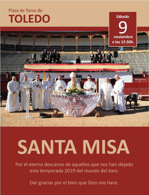 Este sábado, 9 de noviembre, se va a ofrecer una misa en la plaza de toros de Toledo "por el eterno descanso de todos aquellos que nos han dejado esta temporada 2019 en el mundo del toro", según reza el cartel anunciador de la eucaristía. Se trata de "dar gracias a Dios por el bien que Dios nos hace".