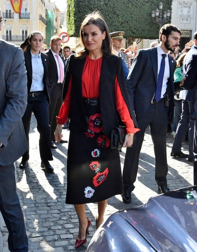 Para la ocasión, Letizia ha elegido una blusa de seda roja de Hugo Boss y una chaqueta negra tipo capa de Zara que ya estrenó en 2015. Pero lo que ha llamado realmente la atención ha sido su llamativa falda negra con bordados de flores rojas y azules.Esta prenda ha generado tanto alabanzas como grandes críticas. La revistaSemanaes muy contundente al calificar la falda de “fallida”y al decir que el look era “horroroso”.