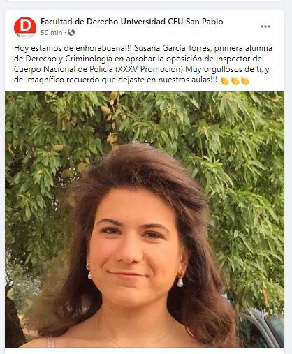 La universidad madrileña ha mostrado su reconocimiento a la joven estudiante: "Hoy estamos de enhorabuena!!! Susana García Torres, primera alumna de Derecho y Criminología en aprobar la oposición de Inspector del Cuerpo Nacional de Policía (XXXV Promoción) Muy orgullosos de ti, y del magnífico recuerdo que dejaste en nuestras aulas!!!".