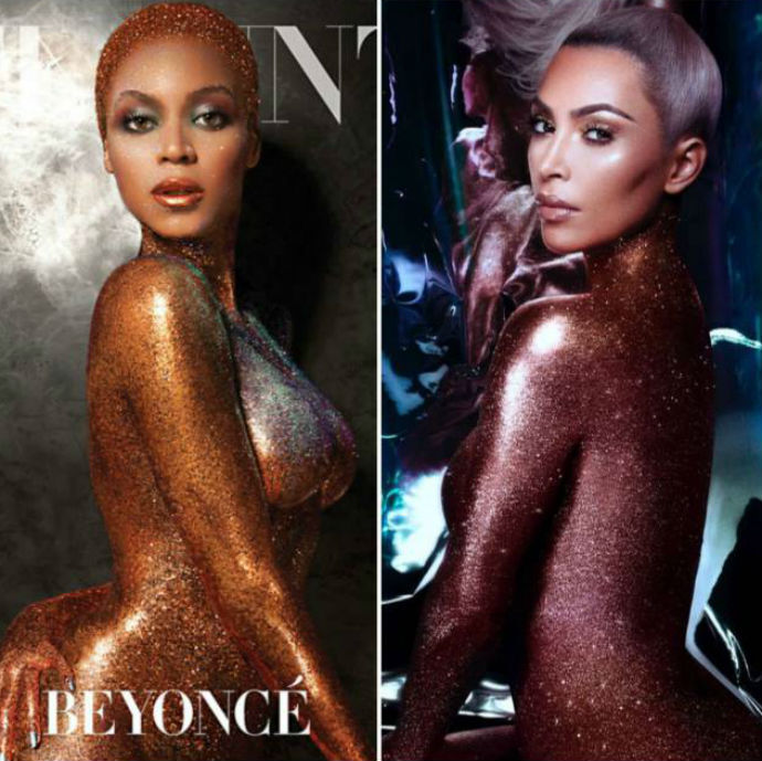 Lo que se han afanado en señalar muchos internautas es que su puesta en escena tiene un parecido más que razonable con la sesión de fotos que la revista Flaunt realizó con Beyoncé en 2013, donde la diva del pop protagonizó la portada de la publicación también desnuda y cubierta entera de purpurina.
