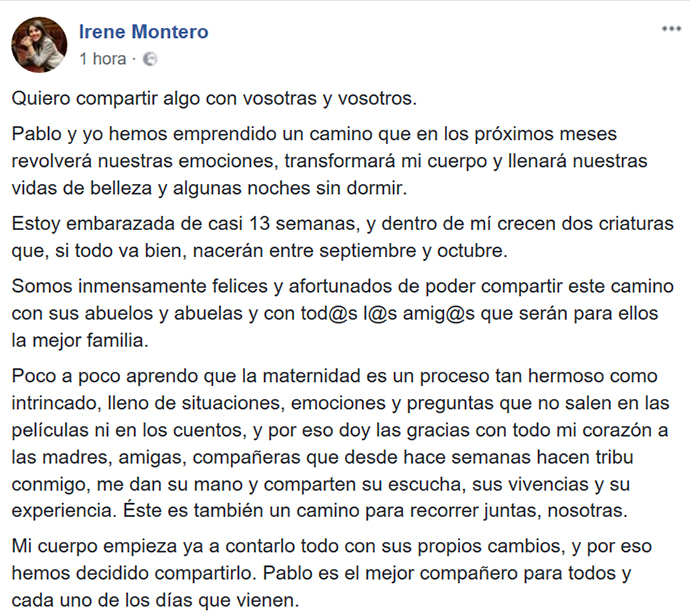 Aunque en pocas ocasiones ha hablado Montero de su relación con Iglesias, para mantener la discreción, en esta oportunidad ha querido compartir con sus seguidores la noticia. Incluso, ha explicado que "poco a poco aprendo que la maternidad es un proceso tan hermoso como intrincado, lleno de situaciones, emociones y preguntas que no salen en las películas ni en los cuentos, y por eso doy gracias con todo mi corazón a las madres, amigas, compañeras que desde hace semanas hacen tribu conmigo, medan su mano y comparten su escucha, sus vivencias y su experiencia".