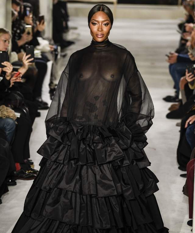 Hacía 14 años que la modelo inglesa no desfilaba para Valentino y este miércoles lo hizo con un fabuloso vestido negro hecho a medida del director creativo de la firma italiana, Pierpaolo Piccioli. Las transparencias del cuerpo mostraban a una Naomi sin ropa interior y con el 'Free the Nipple' (Libera el pezón) por bandera, demostrando que a sus 48 años sigue siendo espectacular.