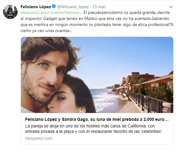 No le han hecho nada de gracia a Feliciano López las especulaciones sobre su vida personal aparecidas en la prensa y las ha desmentido de forma rotunda. En concreto, el tremendo enfado del tenista toledano se ha manifestado a través de su cuenta en la red social Twitter, donde ha criticado las informaciones de El Español sobre su viaje a Estados Unidos para jugar el torneo de Indian Wells, donde según el periódico habría aprovechado para pasar unos días con Sandra Gago, su pareja, en lo la publicación ha denominado su luna de miel 'preboda'.