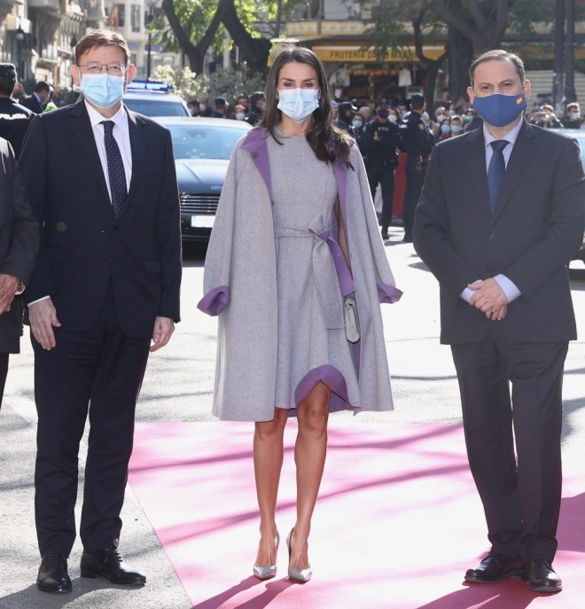 La reina ha combinado el diseño de lana gris, sin mangas y con una cinta a modo de cinturón, con un abrigo del mismo color, con forro morado, dándole un toque muy elegante y favorecedor.