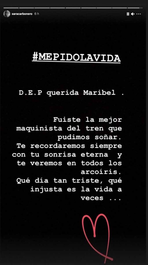 "D.E. P. Querida Maribel. Fuiste la mejor maquinista del tren que pudimos soñar.Te recordaremos siempre con tu sonrisa eternay te veremos en todos los arcoíris," comienza la storie de la toledana en Instagram.