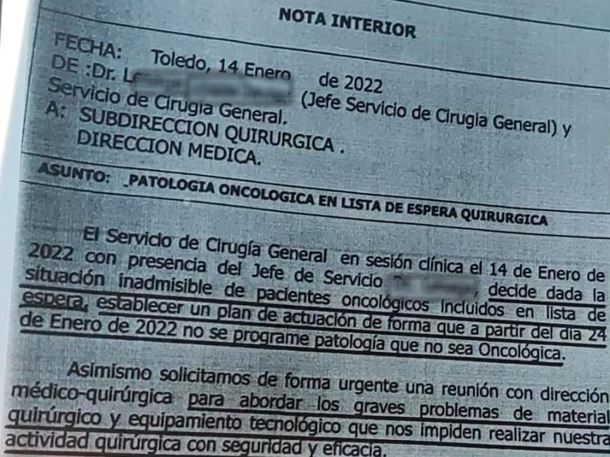 En una nota interna firmada por el jefe del servicio, que fue registrada el pasado 14 de enero, los cirujanos toledanos solicitan una "reunión urgente" con la dirección médico-quirúrgica del Hospital Universitario para abordar dichas dificultades.