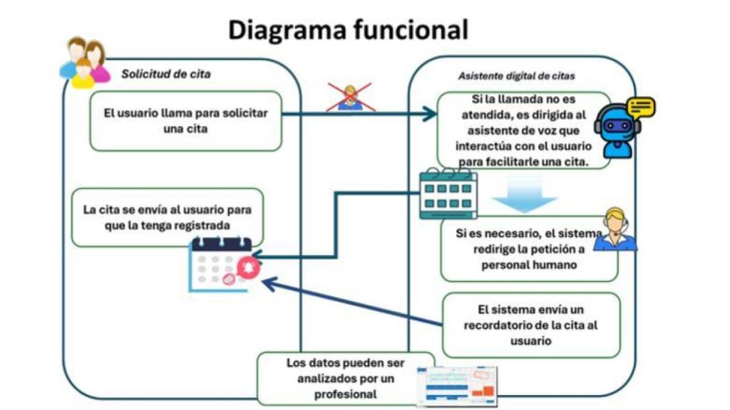 Este novedoso sistema funcionará 24 horas al día y siete días a la semana. Se apoyará en un motor de inteligencia artificial con reconocimiento de voz y procesamiento de lenguaje natural, pensado para mantener un diálogo fluido con el usuario, entender distintos acentos y conducir la conversación hasta un resultado final satisfactorio. Permitirá la solicitud, modificación, cancelación y confirmación de citas, además de recordar las mismas unos días antes.