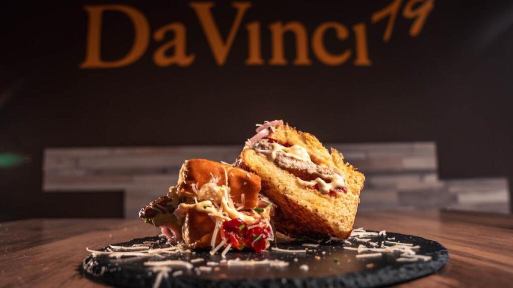 Solomillo ibérico, brioche, salsa de huevo, pimiento rojo caramelizado, cebollino, cebolleta encurtida y queso manchego son los ingredientes de un bocadillo "brutal" que nace como homenaje a Leonardo Da Vinci, según sus creadores.