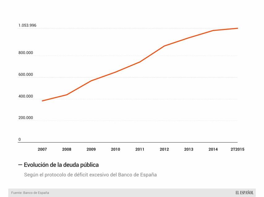 Sánchez prefiere no recordar que la deuda pública española estaba a finales de 2007, antes de la segunda legislatura de Zapatero, en 383.798 millones de euros. Cuando Rajoy llegó al poder, el endeudamiento español alcanzaba ya 743.530 millones y hoy está por encima del billón de euros: 1.053.996 millones a cierre del segundo trimestre de 2015.