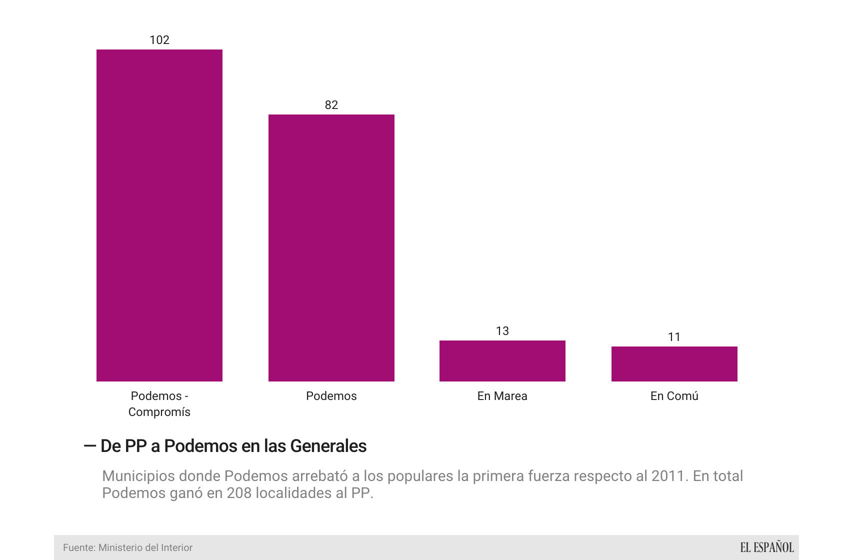 Podemos ha ganado en 208 municipios en los que lo hizo el PP