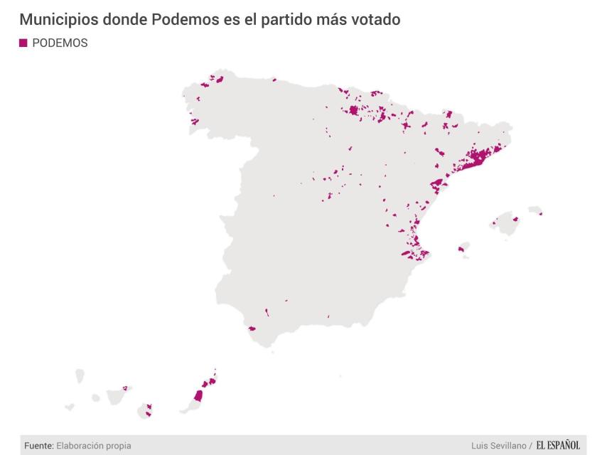 La estrategia del partido de Pablo Iglesias de confluir con diferentes marcas ha facilitado que sea la fuerza más votada en 454 localidades.