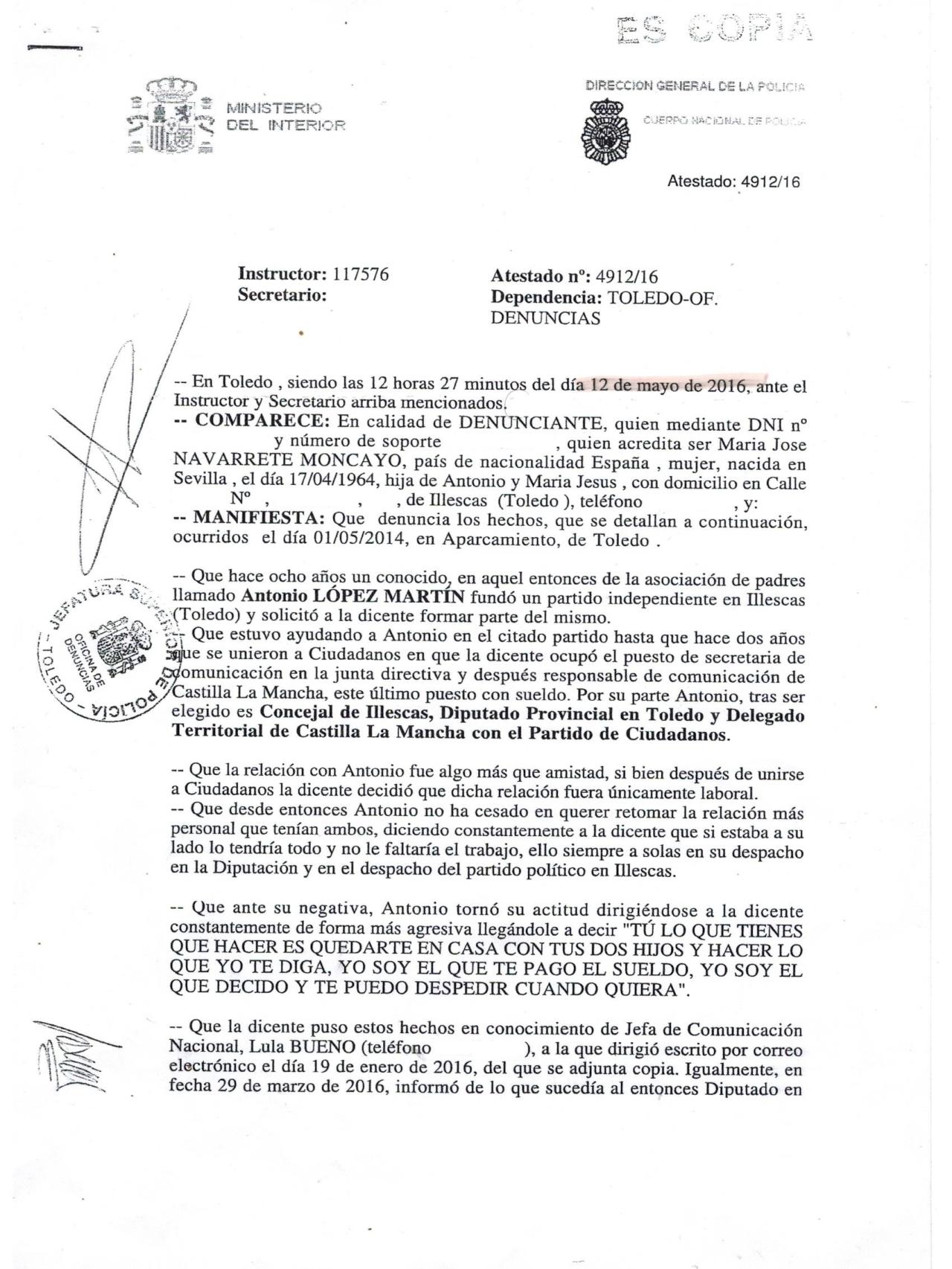 “Tú lo que tienes que hacer es quedarte en casa con tus dos hijos y hacer lo que yo te diga. Yo soy el que te paga el sueldo, yo soy el que decido y te puedo despedir cuando quiera”. De esta forma amenazaba supuestamente Antonio López Martín, diputado provincial en Toledo y líder de Ciudadanos en Castilla La Mancha hasta hace tres semanas, a la jefa de redes sociales del partido en esta región, María José Navarrete, que el pasado 12 de mayo lo denunció ante la Policía Nacional por un presunto caso de acoso sexual y laboral. En la denuncia, a la que ha tenido acceso EL ESPAÑOL, Navarrete considera que fue despedida en abril por su negativa a retomar la relación que mantenía con López Martín.