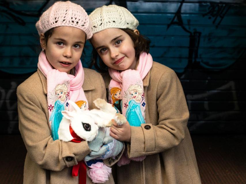 Ana e Isabel Ríos con su mascota Nieve. Les gustan todos los animales menos los salvajes. Ellas se ocupan pero su madre al final también se tiene que encargar del animalito. El conejito tiene un año y hace unos seis meses le dio un vértigo y como secuela le quedó una tortícolis. Lo han traído para ver si le cura el santo.