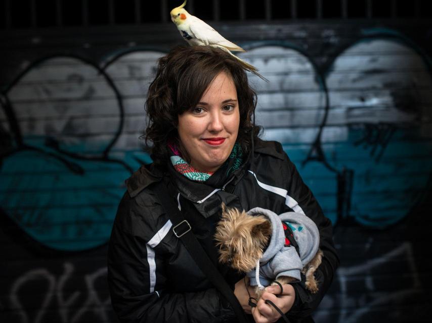Sofía Parras con sus mascotas Blanquito y Nala. La perrita es una Yorkshire de diez años que fue adoptada hace un año porque fue abandonada. Blanquito es una ninfa carolina (de la familia de las cotorras) que tiene entre sus habilidades la de silbar el himno del Real Madrid y el Puente sobre el Río Kwai. Es muy dócil y parece un perro. Desayuna con su padre, quien le da café con leche y pica las tostadas.