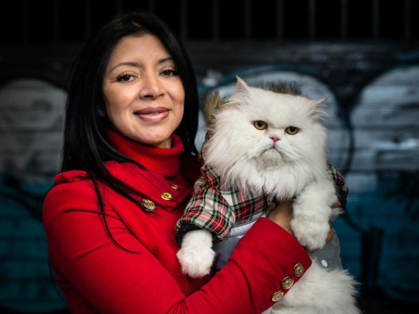 Katia Pérez con su gato persa Kenzo. Tiene ocho años y lo adoptaron con cinco porque sus antiguos dueños no podían con él. Pesaba doce kilos y casi se arrepienten pero finalmente les ha cautivado a todos. Es muy bueno y amoroso. Sus hijos le llaman hermano porque ya es uno más de la familia.