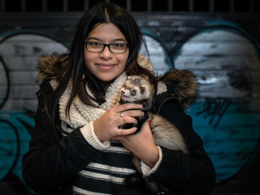 Macarena Chozas con su hurón Pumba. Tiene tres años, es amigable, sociable y el mejor amigo que tiene. Sale todos los días al parque y se relaciona con perros que le huelen pero no le hacen nada. Tiene una habilidad muy especial y es que corre muy bien hacia atrás.