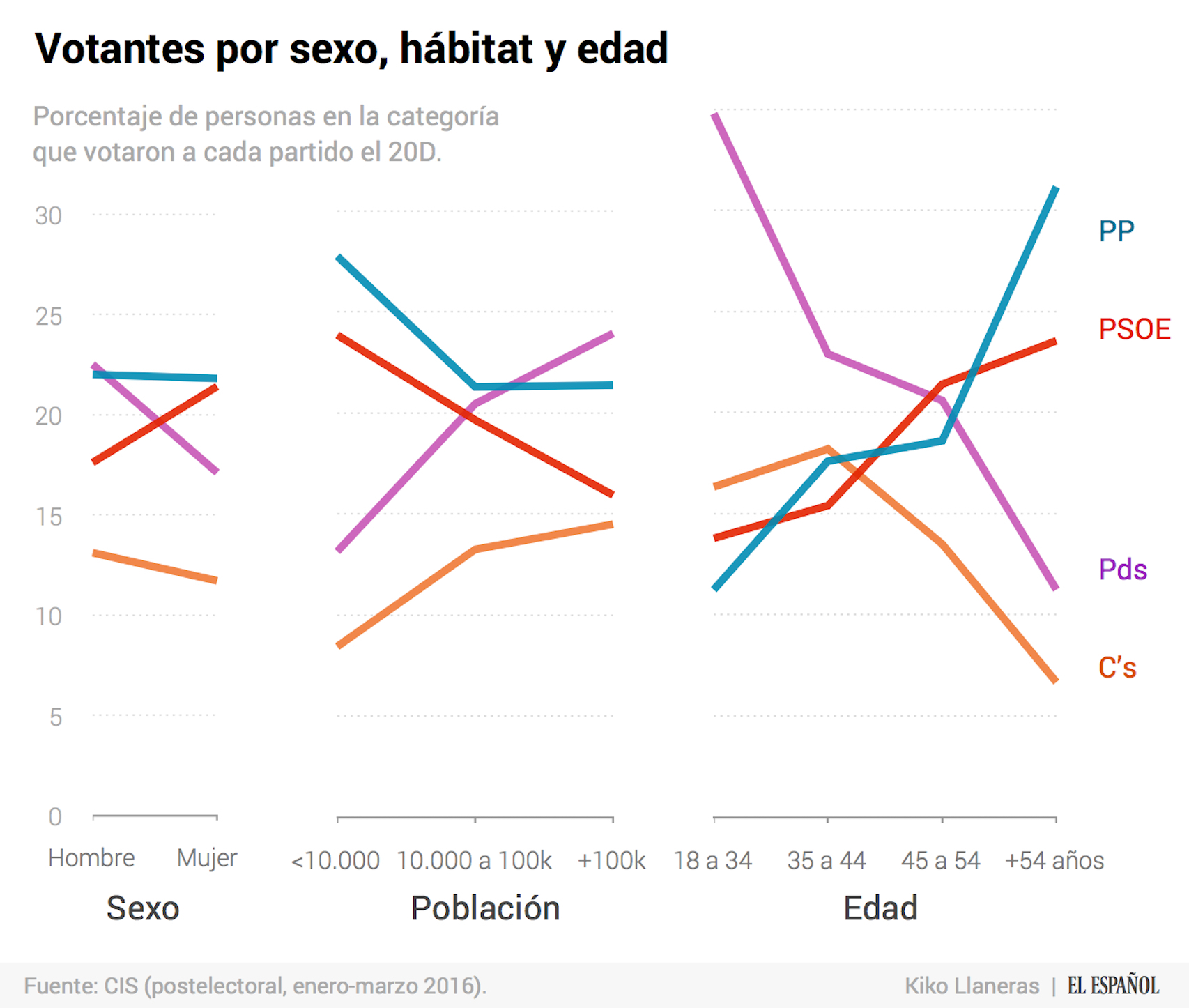 Nota. Por concisión, en este texto a veces uso el término «votante» para referirme a las personas que declararon su voto al ser entrevistados por el CIS. Es importante tener en cuenta que no todo el mundo declara su voto. De los entrevistados que afirman haber votado el 20 de diciembre, un 10,9% prefirió no declarar su voto, un 21,9% dijo haber votado al PP, un 19,5% al PSOE, un 20,1% a Podemos, un 12,3% a Ciudadanos.