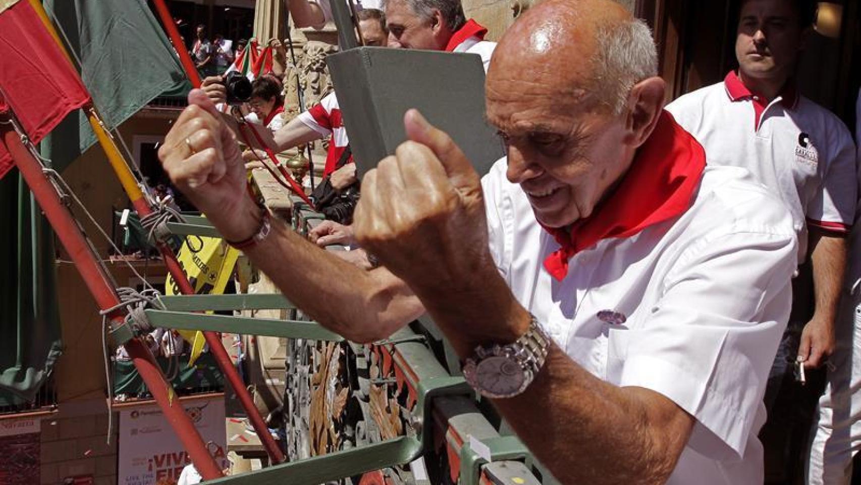 El Tuli", promotor del cántico a San Fermín previo al encierro en los años 50 y elegido por primera vez en una votación popular, acompañado por el alcalde de Pamplona, Joseba Asirón, durante el lanzamiento del chupinazo desde el balcón del Ayuntamiento de Pamplona. /Villar López. /Efe