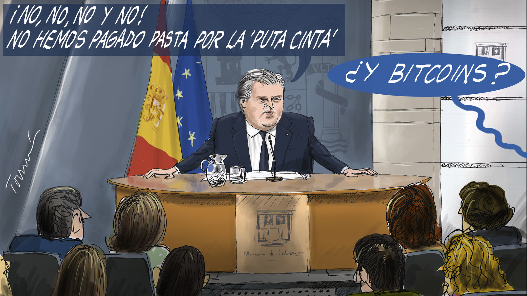 Íñigo Méndez de Vigo comparecía apenas dos horas después de que este periódico ofreciese en primicia esta información y, a preguntas de este mismo medio, respondió con un sonoro "no, no, no y no" respecto a cualquier tipo de chantaje hacia el presidente del Gobierno para que esa cinta no saliera nunca a la luz.