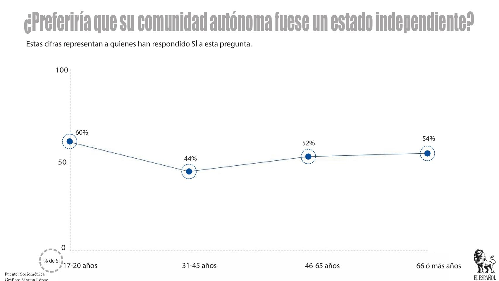En este sentido en Cataluña en todos los intervalos de edad el apoyo a un Estado independiente es elevado ya que siempre pasa del 44%. Sin embargo, este no es un dato nuevo ya que en los últimos años son más los grupos sociales que se han sumado a la causa.