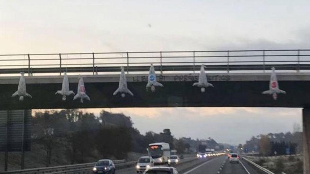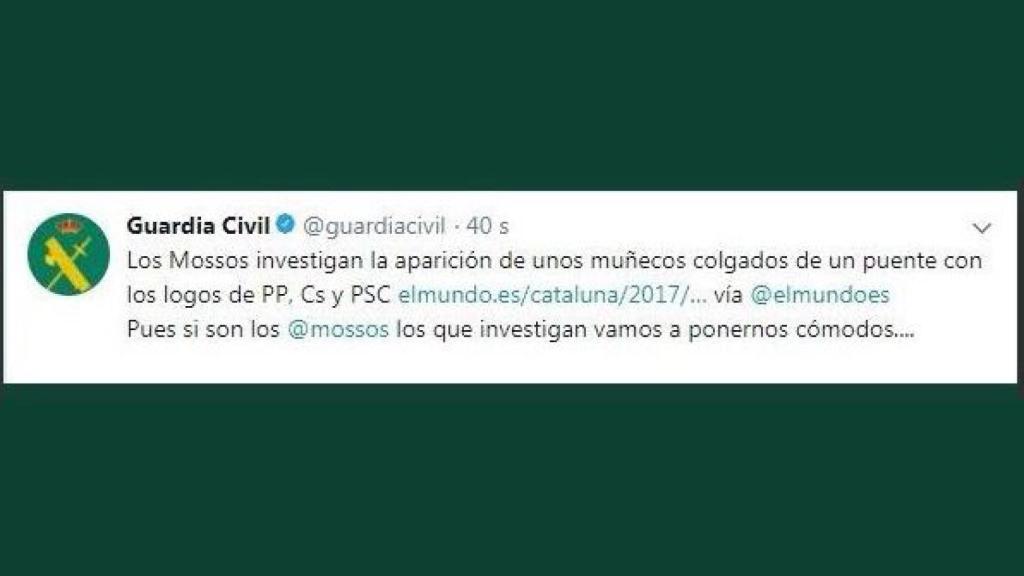 La Guardia Civil ha publicado durante la mañana de este viernes un polémico tuit que más tarde han tenido que retirar y han calificado como un "terrible error". En la publicación ponían en duda la investigación de los Mossos d'Esquadra sobre sobre los muñecos que han aparecido esta mañana en la carretera C17 entre Vic y Tona, simulando el asesinato de votantes del PP, el PSC y Ciudadanos. El puente del que colgaban llevaba el lema "libertad para los presos políticos".