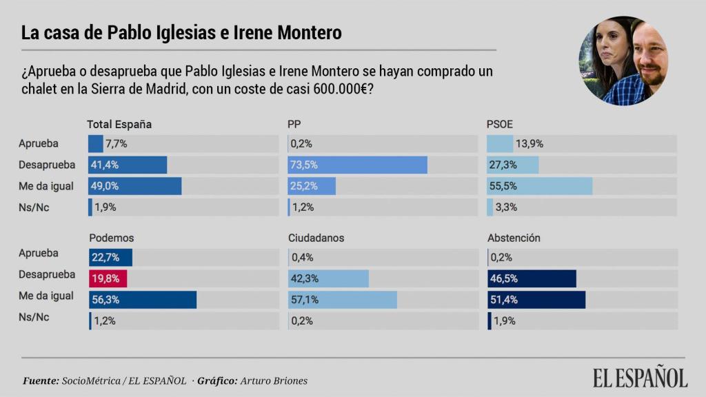 La compra del chalé es un problema para Podemos de imprevisibles consecuencias. Los resultados de este sondeo de SocioMétrica para EL ESPAÑOL muestran que existe un fuerte malestar entre los propios votantes de la formación, amén de un rechazo de la mayoría de españoles. Cifras que pueden ahondar en una crisis que ha colocado al partido morado en una suerte de shock emocional.