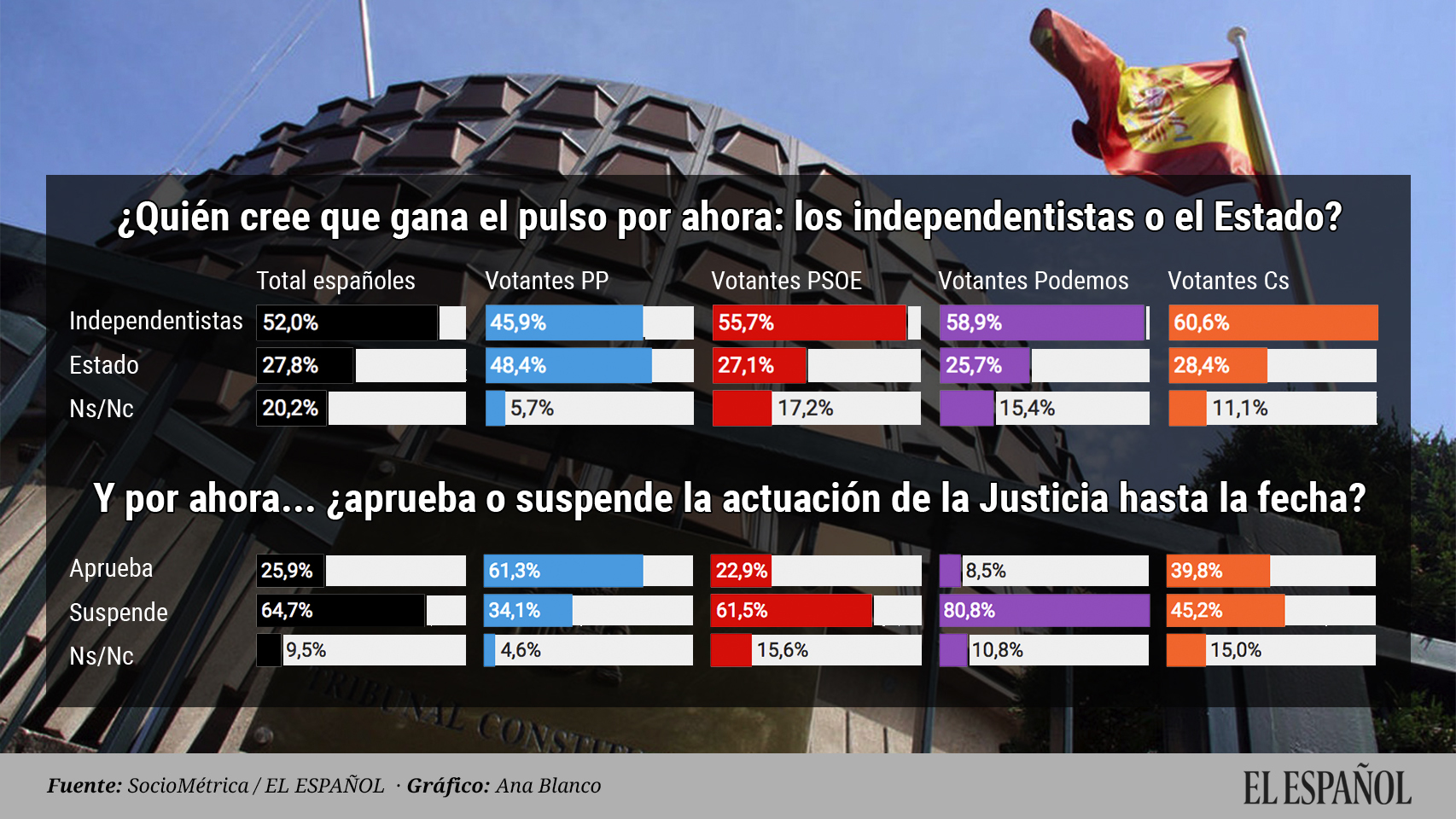 La mayoría de españoles considera que los independentistas están ganando el pulso al Estado en Cataluña. Hasta el 52% de los ciudadanos opina que los separatistas se están imponiendo y el 64,7% suspende la actuación de la Justicia en este envite histórico, según el sondeo de SocioMétrica para EL ESPAÑOL.