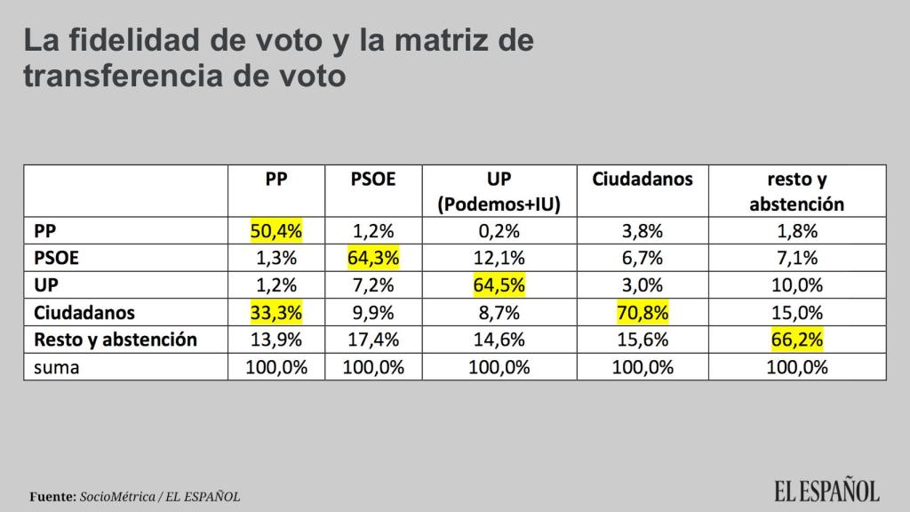 El trasvase de votos del PP hacia Cs consolida al partido de Albert Rivera como la fuerza más votada. De hecho, la formación naranja es el partido que más fideliza a su votante. El 70,8% de los que ya le votó en 2016 volvería a hacerlo hoy. Aunque en menor medida, el PSOE también capitaliza su moción de censura y retendría al 64,3% de sus votantes. El escándalo del chalé de Pablo Iglesias e Irene Montero no les ha pasado factura y el 64% de los encuestados que apostaron por Podemos en las últimas elecciones lo haría de nuevo.