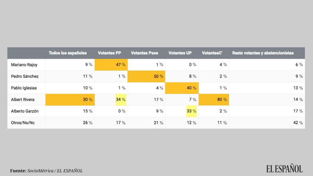 En el caso de los votantes del PSOE, el 50% respaldaría a Pedro Sánchez, pero el 17% de los socialistas reconoce que su líder favorito también es Albert Rivera. Entre los afines a Podemos, solo el 40% prefiere a su líder, Pablo Iglesias. El 33% de los votantes del partido morado elige al líder de Izquierda Unida, Alberto Garzón, el 8% al socialista Pedro Sánchez y el 7% al presidente de Ciudadanos.