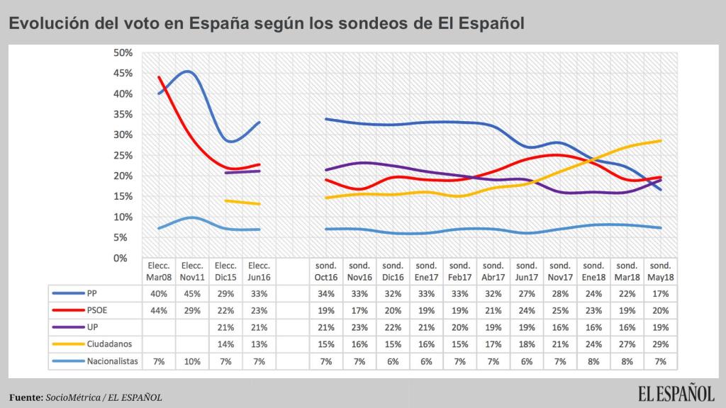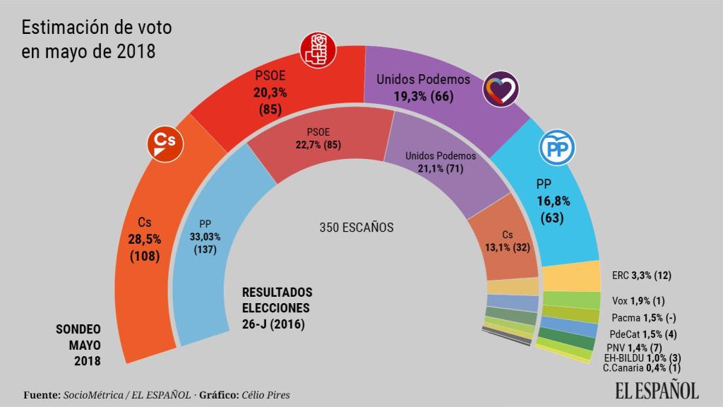 El Partido Popular se derrumba a un ritmo vertiginoso. Si las elecciones generales se celebrasen hoy, Mariano Rajoy solo atraería al 16,8% de los votantes y su formación se quedaría como cuarta fuerza política en el Parlamento al conseguir tan solo 63 escaños. Según la encuesta que SocioMétrica ha diseñado para EL ESPAÑOL, la primera tras conocer la sentencia de Gürtel y la moción de censura presentada por Pedro Sánchez, Ciudadanos se convertiría en el partido más votado por los españoles.