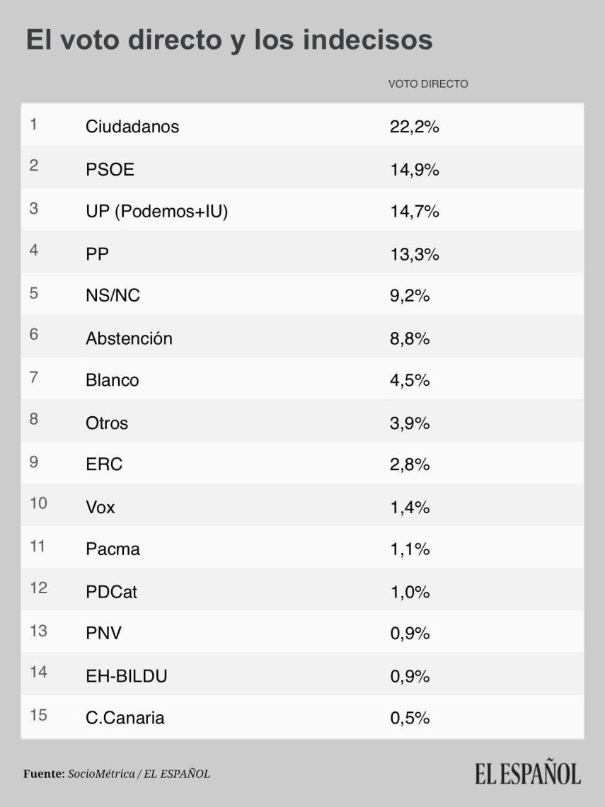 El Partido Popular también se convertiría en cuarta fuerza política si se analiza la intención de voto directa. Preguntados por cuál sería el partido que votaría si las elecciones se celebrasen mañana, el 22,2% de los encuestados responde que a Ciudadanos; el 14,9% al PSOE; el 14,7% a Unidos Podemos y tan solo el 13,3% fiaría su papeleta a los conservadores.