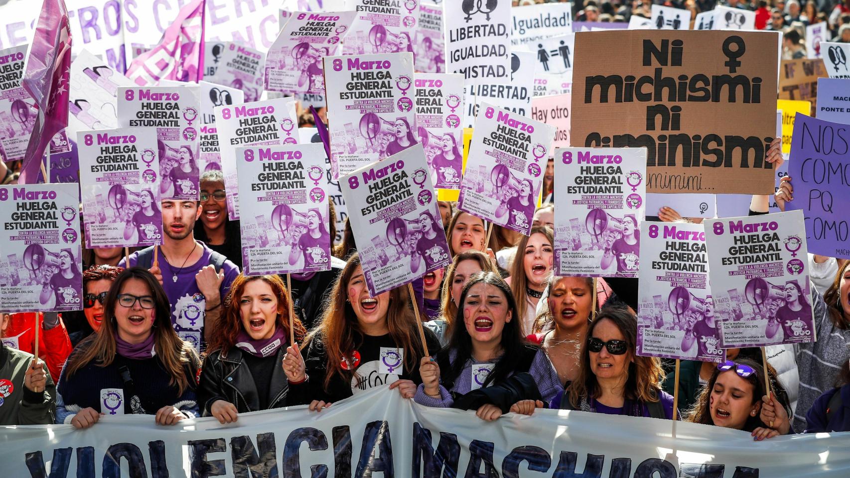 Un grupo de chicas sujetan una pancarta en una manifestación en Lavapiés (Madrid).
