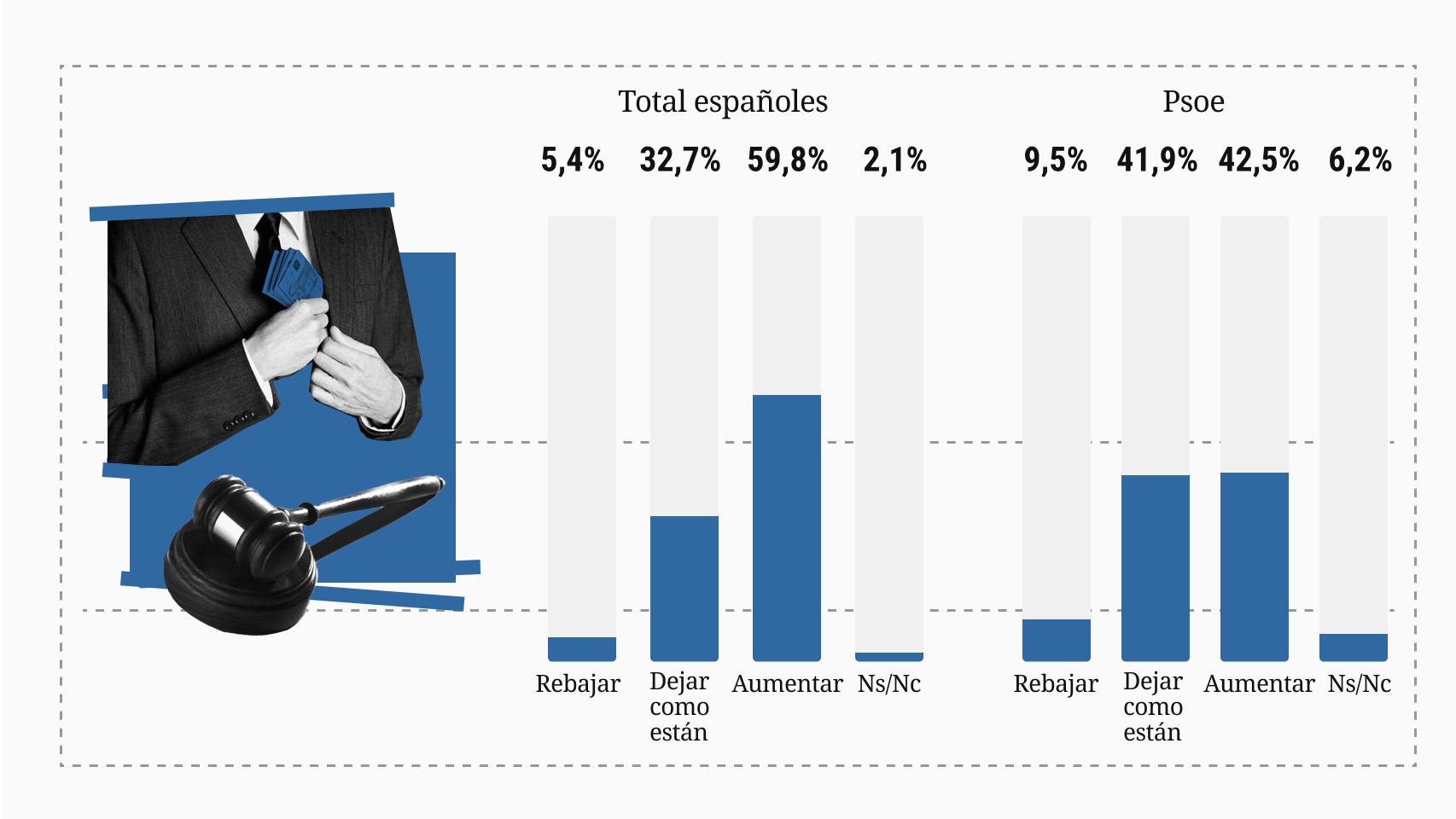 Poco más del 5% de la población española es partidaria de rebajar las penas que contempla actualmente el Código Penal para el delito de malversación. Y únicamente el 9,5% de los votantes del PSOE —ni siquiera uno de cada diez simpatizantes de Pedro Sánchez— apoyan esta reforma legal, según se desprende del último sondeo elaborado por SocioMétrica para EL ESPAÑOL.