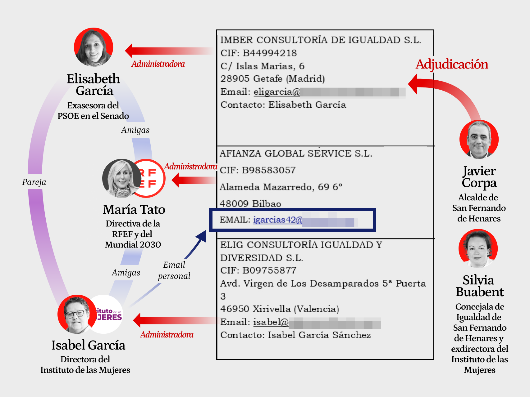 Afianza Global Service SL, una empresa de María Tato, directiva de la Real Federación Española de Fútbol y miembro del Comité Ejecutivo del Mundial 2030, se presentaba a los concursos para el amaño de contratos en favor de Isabel García, directora del Instituto de las Mujeres. El objetivo era crear la apariencia de que concurrían distintas empresas y ocultar que todo estaba pactado de antemano.