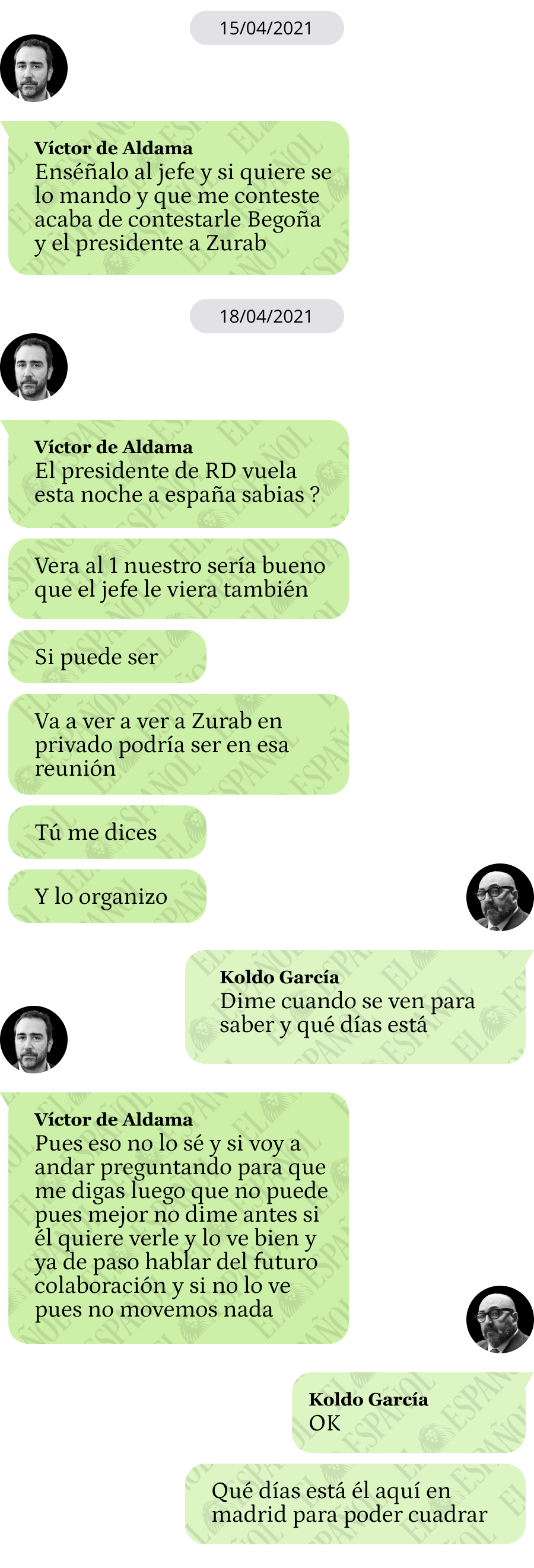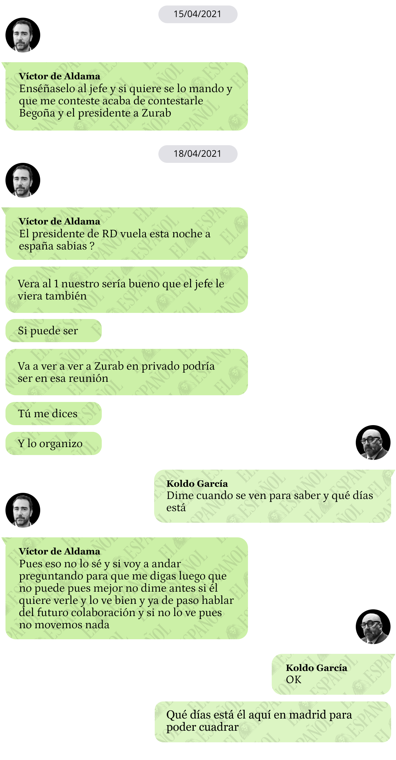 Aldama envía un documento a Koldo García el 15 de abril de 2021 junto al siguiente mensaje: "Enséñaselo al jefe y si quiere se lo mando y que me conteste acaba de contestarle Begoña y el presidente a Zurab [sic]".