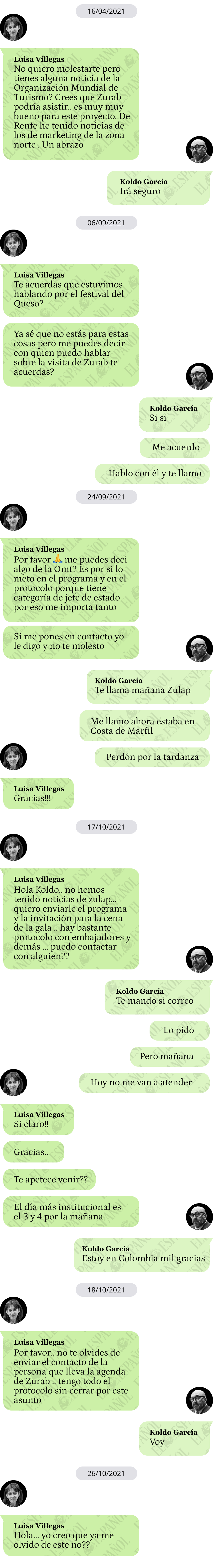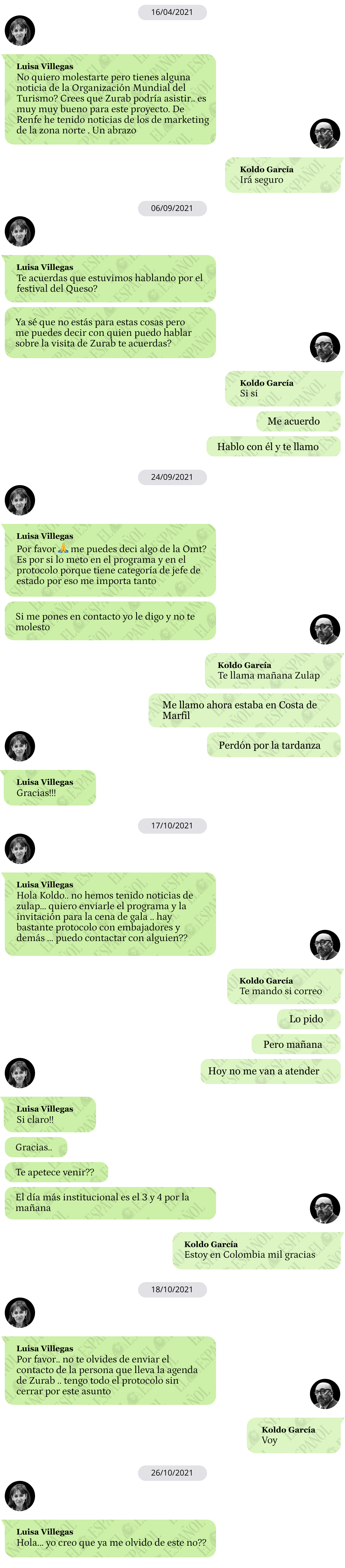 En una de las conversaciones a las que ha tenido acceso este periódico, Luisa Villegas, directora del Festival Asturias Paraíso Natural International Cheese Festival, pedía su presencia al asesor de Jose Luis Ábalos: "Crees que Zurab podría asistir.. es muy muy bueno para este proyecto".