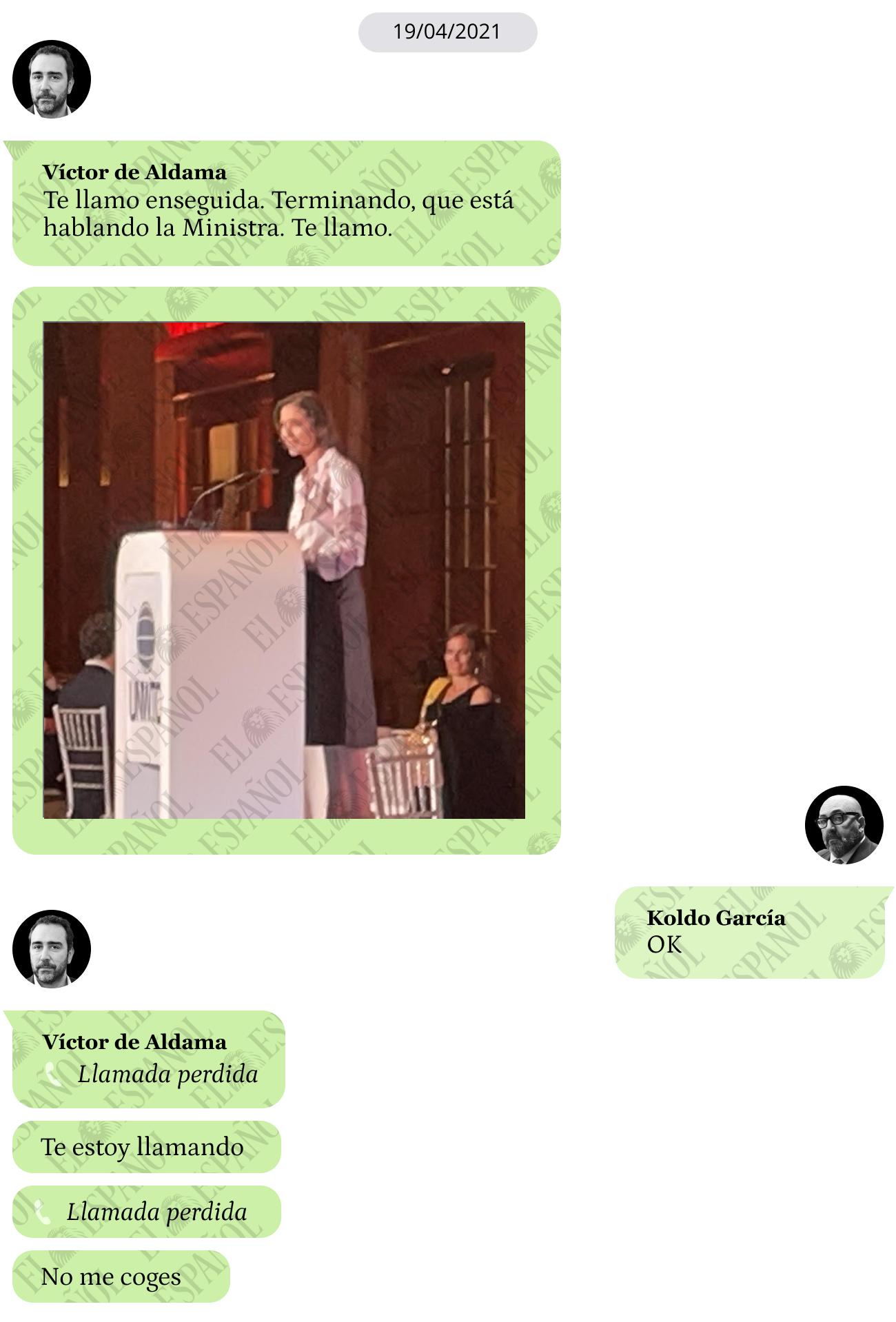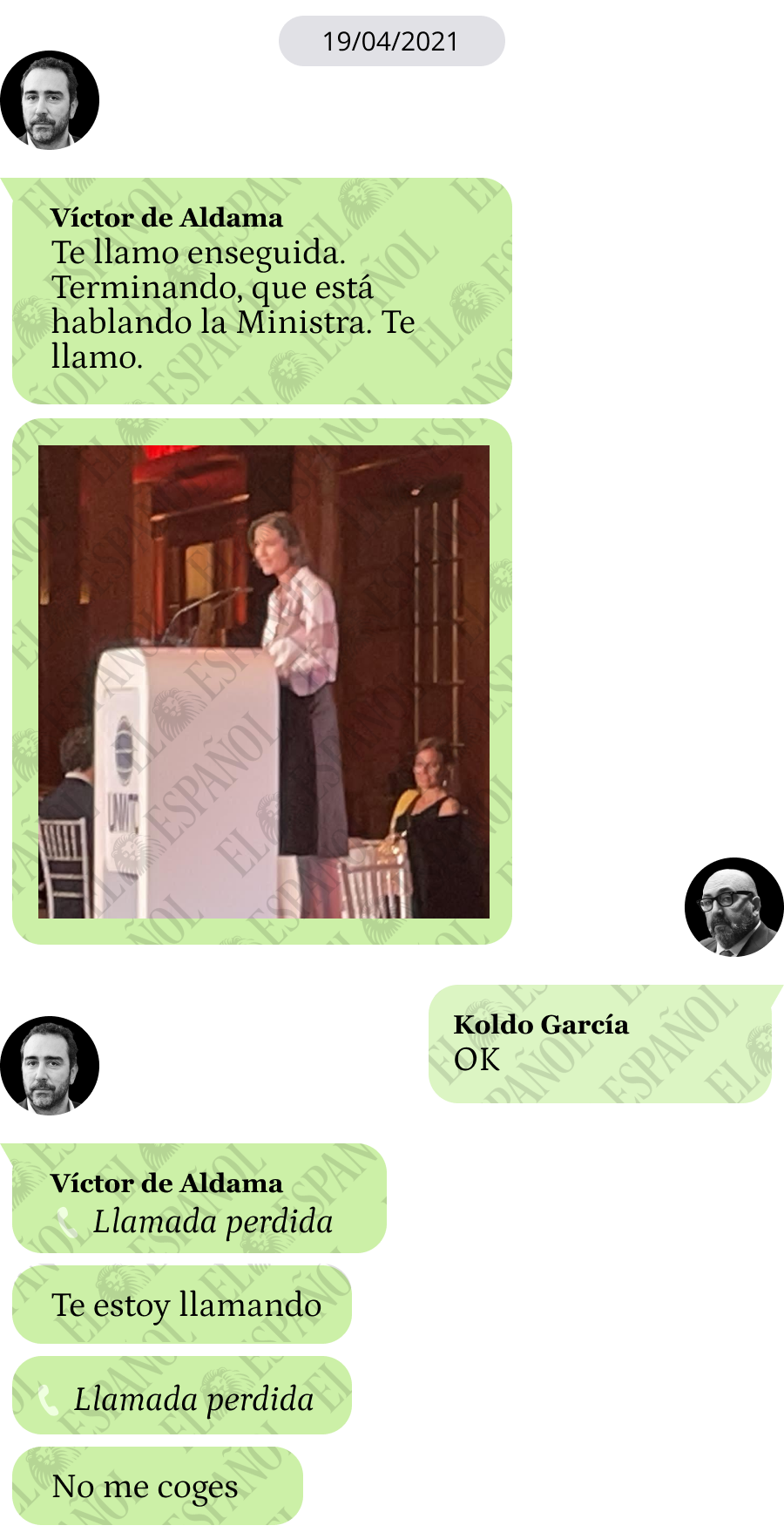 A lo que Víctor de Aldama respondió: "Te llamo enseguida terminando que está hablando la ministra. Te llamo", seguido de una foto de la ministra durante su discurso.
