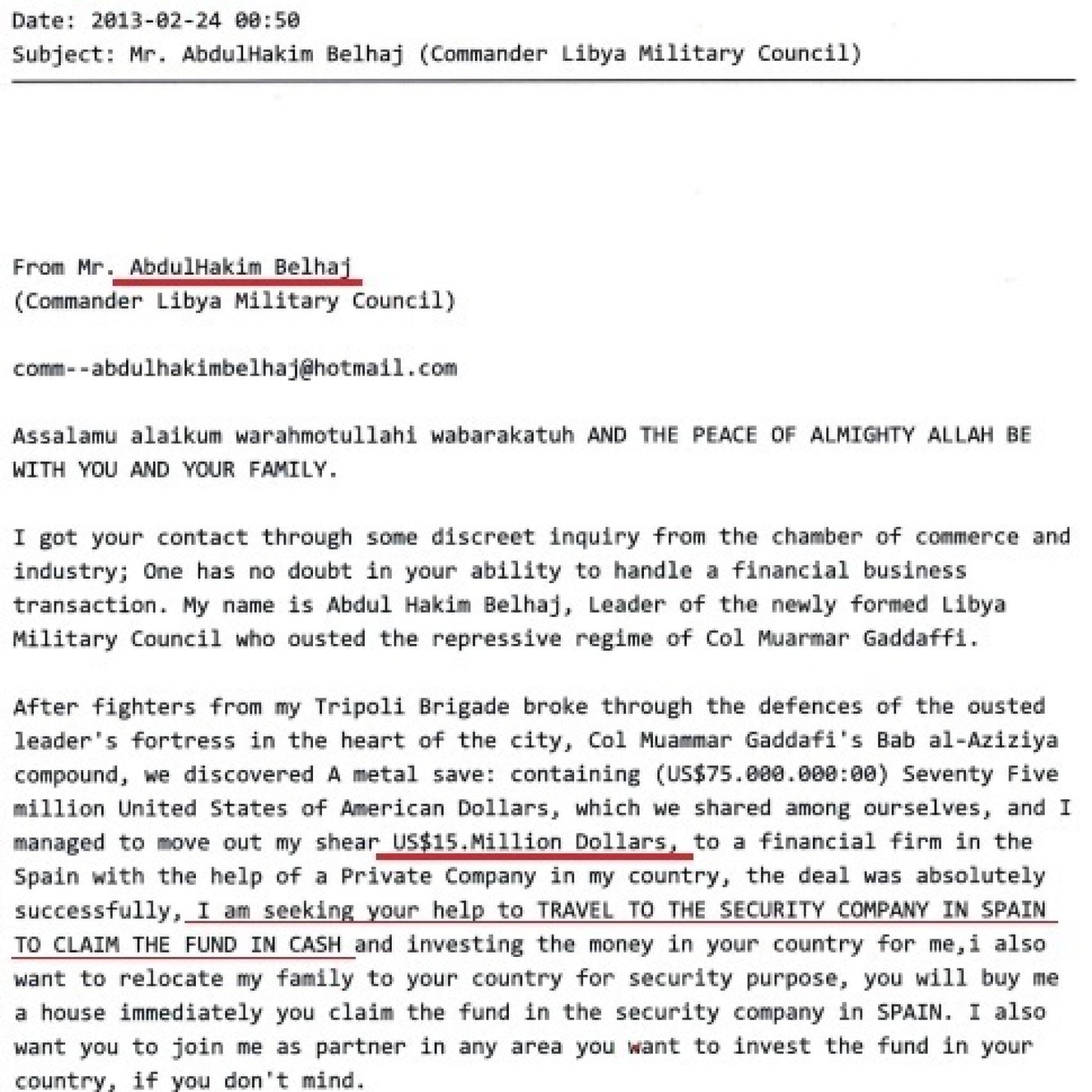 El citado texto se le atribuye a un destacado rebelde llamado Abdul Halkim Belhaj, exlíder del Consejo Militar de Libia formado tras el derrocamiento de Gadafi. En el mensaje se hacen pasar por este opositor que sí existe y que actualmente es dirigente político en su país. El correo relata que, cuando sus tropas lograron entrar en la “fortaleza” de Gadafi, encontraron una caja fuerte con 75 millones de dólares americanos.