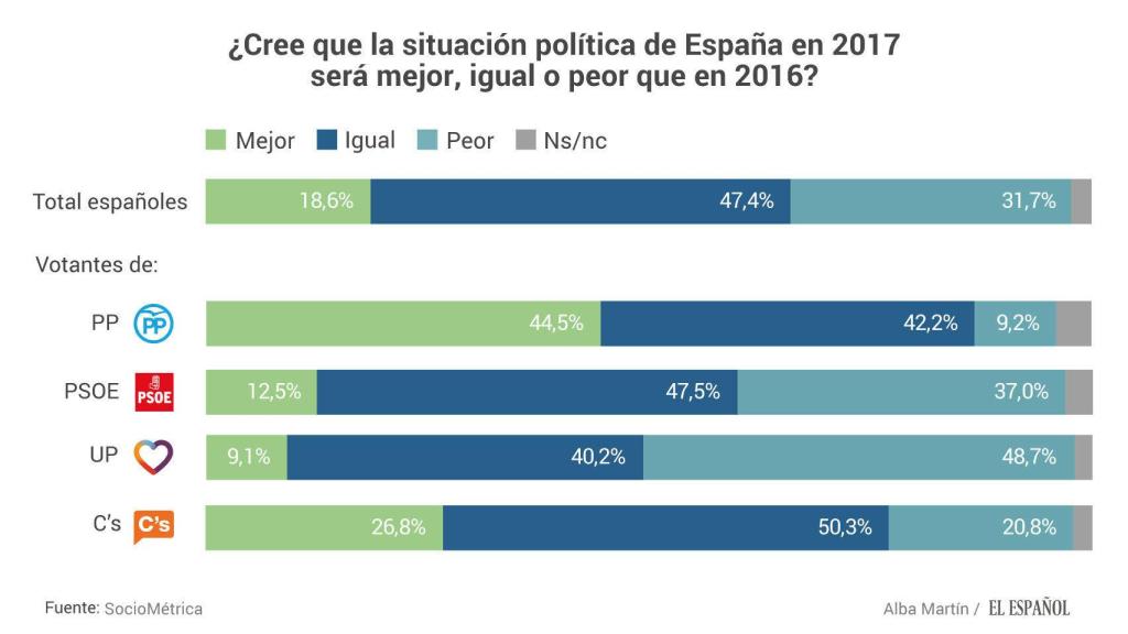 Hoy, la situación se ha dado la vuelta para los votantes de Unidos Podemos que son los más pesimistas respecto de la situación política futura, un 48,7% de sus votantes piensa que ésta será peor en 2017. Le siguen, a más de diez puntos porcentuales de distancia, los del PSOE con un 37% y después vienen los de Ciudadanos, con un 20,8%, y los del PP con un 9,2%.