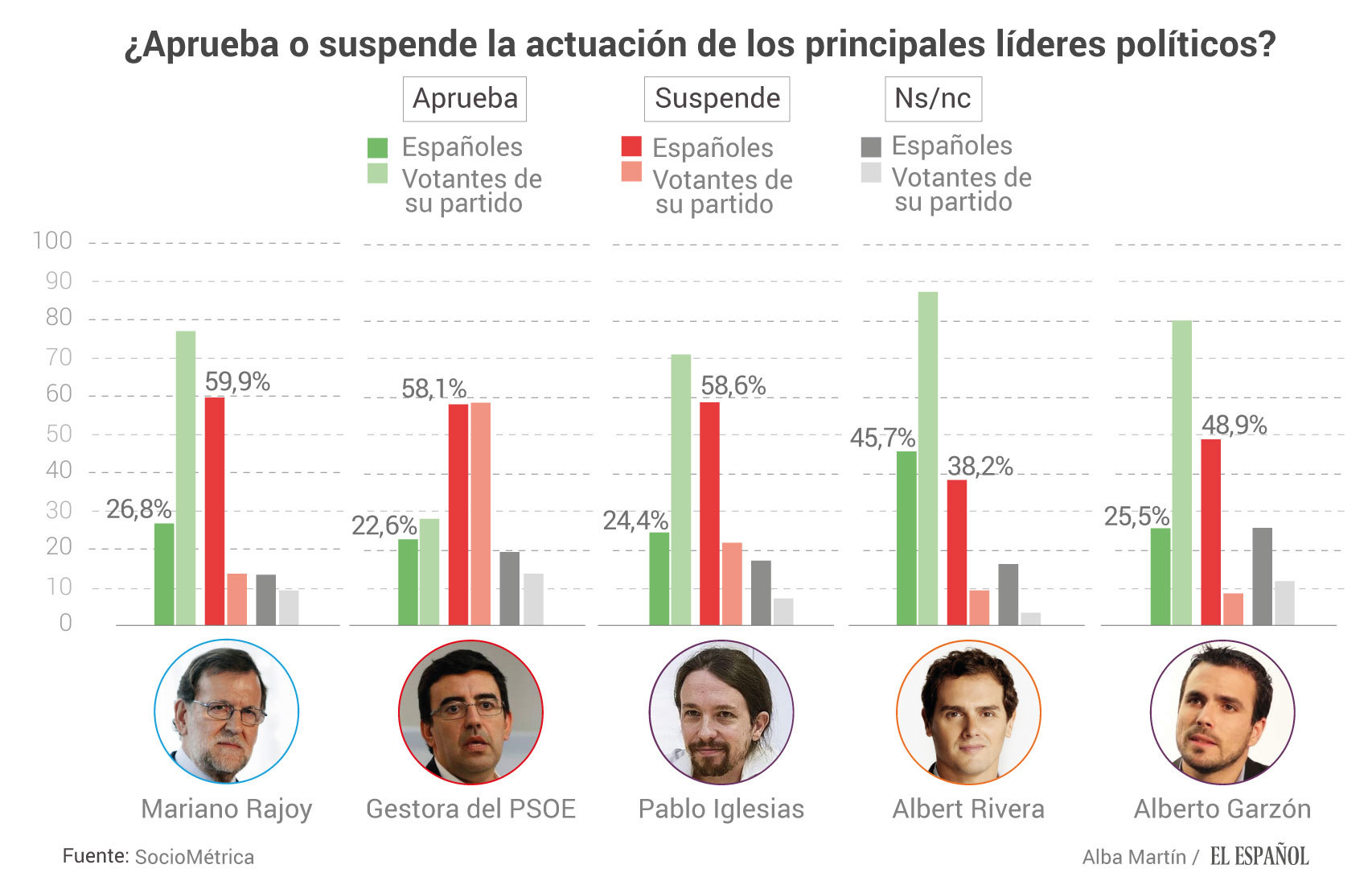 La imagen de Rajoy no ha mejorado tras dos meses con plenas funciones como presidente del Gobierno. Un 59,9% de los españoles le suspende como líder político y sólo uno de cada cuatro españoles aprueba su gestión, según el macrosondeo EL ESPAÑOL / Sociométrica. Un porcentaje muy similar suspende a la Gestora del PSOE (58,1%) y a Iglesias (58,6%), algo que sirve para complementar el análisis de la estimación de voto.