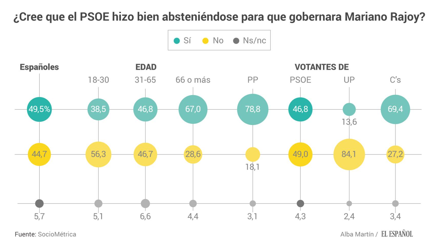 Seis meses después del fatídico comité federal donde Pedro Sánchez dimitió y la inédita abstención socialista para que Mariano Rajoy pudiera formar gobierno, los españoles están completamente divididos entre los que opinan que lo mejor fue abstenerse (el 49,5%) frente a los que mantienen que hubiera sido mejor que los socialistas votaran no y se volvieran a convocar elecciones (el 44,7%).