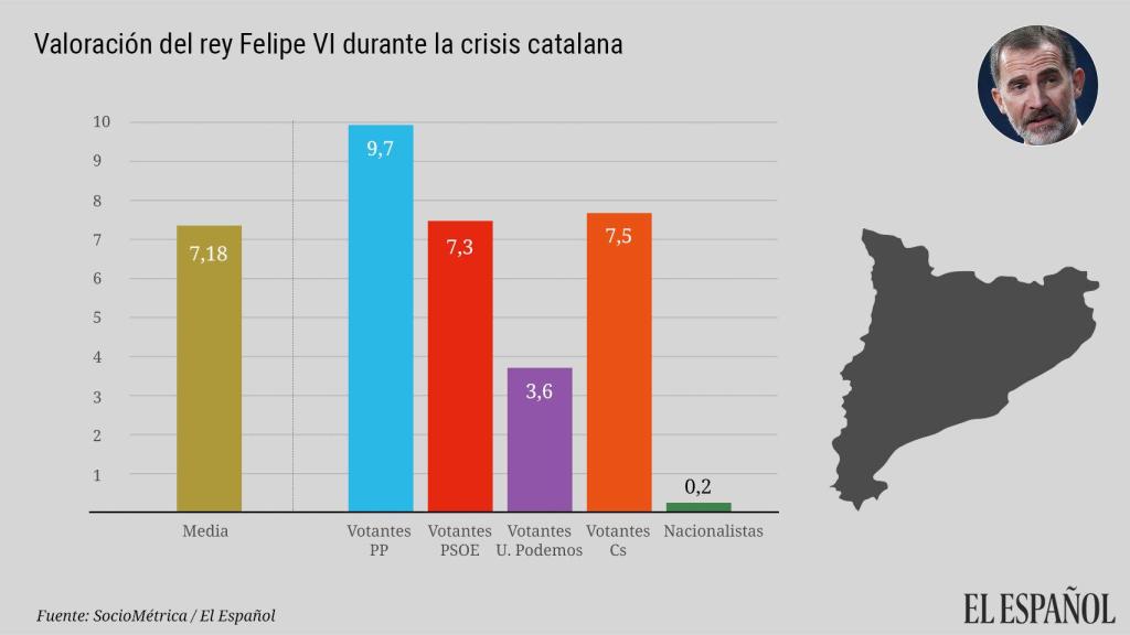 En enero de este año, según SocioMétrica, la valoración del Rey era 6,4. La nota de 7,2 que obtiene ahora no sólo confirma la tendencia alcista en la popularidad de la Corona desde que Felipe VI asumió la jefatura del Estado, sino que también premia su papel durante la crisis catalana.