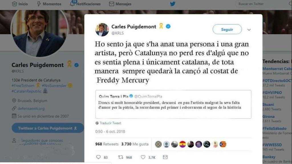 "Será parte de la banda sonora de Barcelona, con aquella memorable actuación junto al gran Freddie Mercury". De esta manera se despedía a través de Twitter Carles Puigdemont de Montserrat Caballé, fallecida este sábado en la ciudad condal. "Catalana universal, estrechamente vinculado con el Liceu y Barcelona", decía Quim Torra en la misma red social.