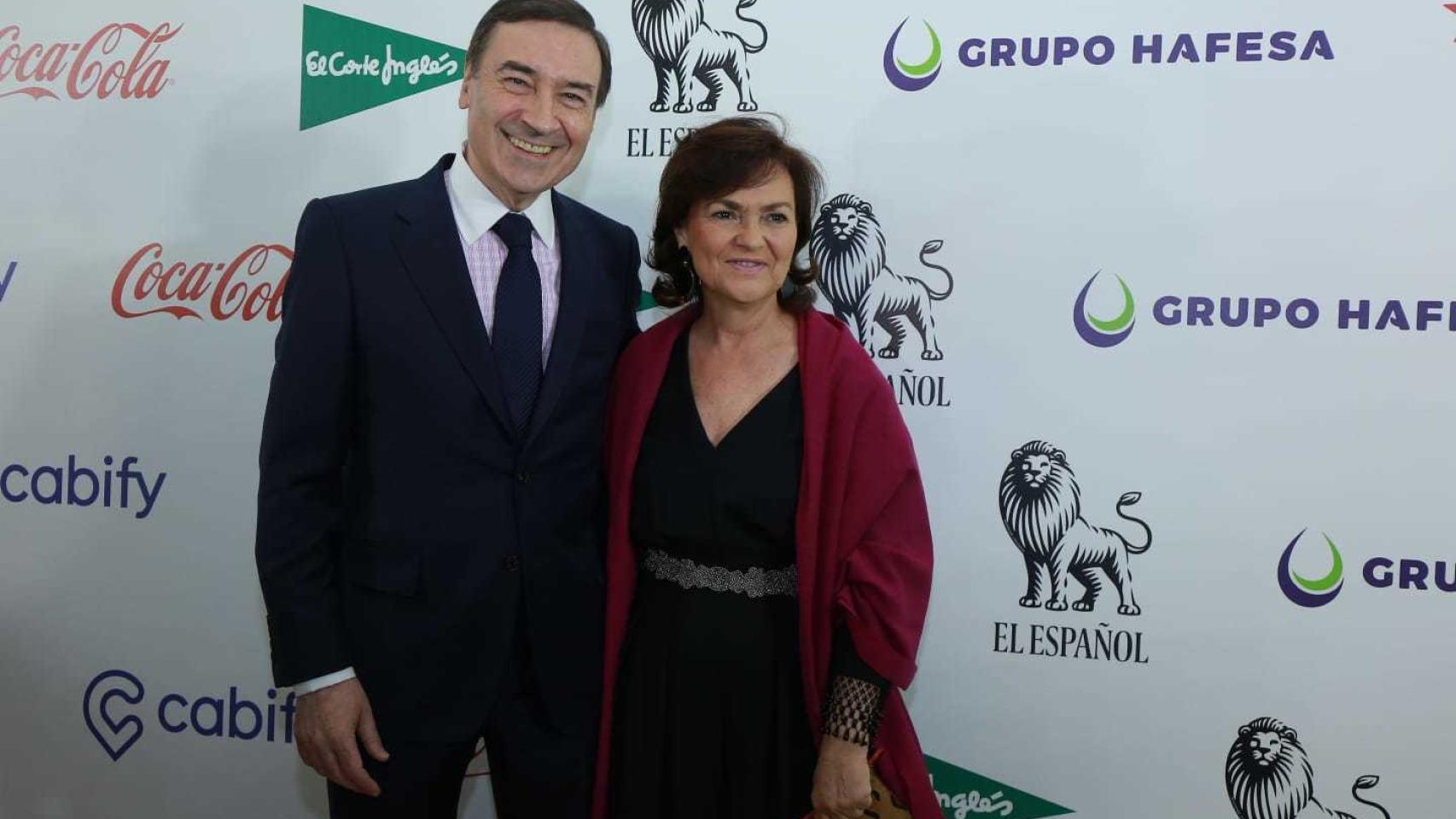 Pedro J. Ramírez junto a la vicepresidenta del Gobierno, Carmen Calvo y Cruz Sánchez de Lara, miembro del Consejo de Administración de EL ESPAÑOL y esposa del director.